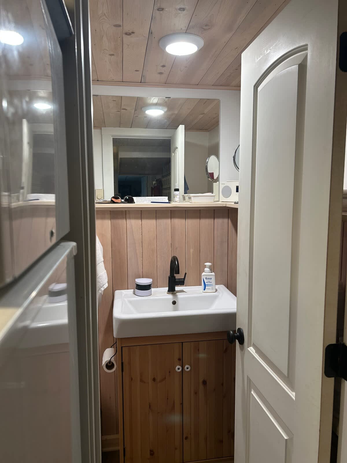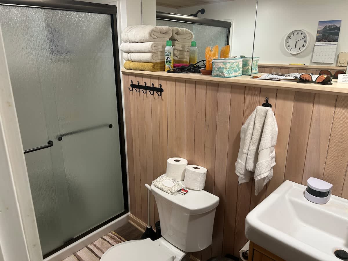 Peaceful and centrally located, welcome to a private cozy suite in the basement of our home, featuring a small living room with a loveseat, 55" TV, and gas fireplace; kitchenette with a sink, electric range, refrigerator, microwave, and a maple counter with bar stools; private bathroom with a shower (no tub); and a bedroom with a full size bed, desk, and a large egress window. The entire suite is yours, and is separated from the rest of the house with a sliding "barn door." Access via back door.
